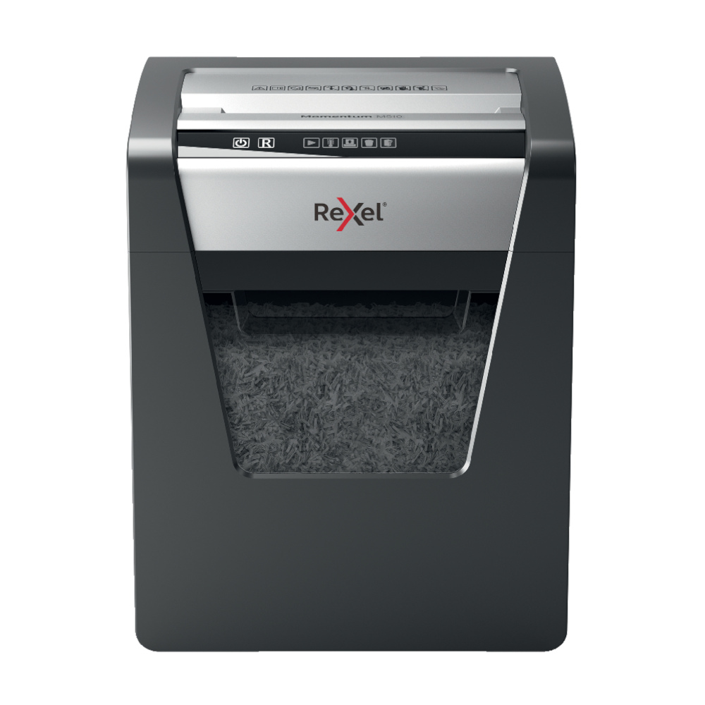 A destruidora de papel Rexel Momentum M510 destrói até 10 folhas de uma só vez e funciona ininterruptamente por 2 horas.